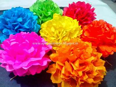 - Paper in colors you like, cut in squares. 5 for one flower OR 60 for the full hanging (12 flowers)
